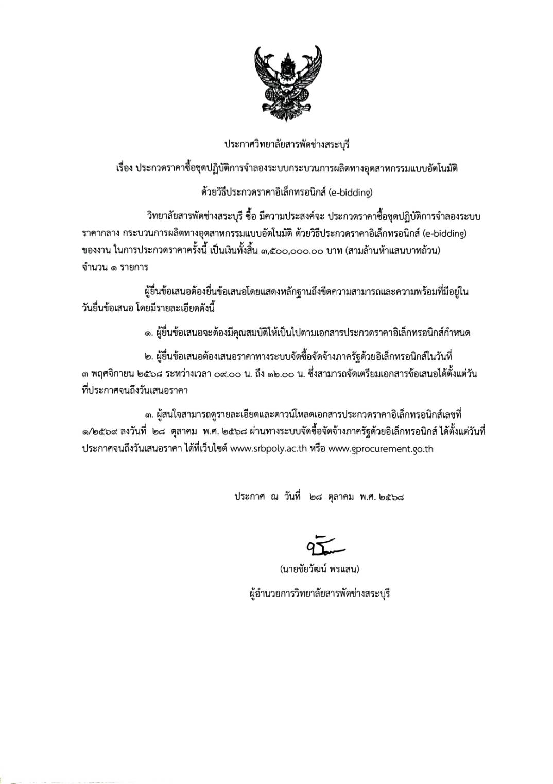 ประกาศ ประกวดราคาซื้อชุดปฎิบัติการจำลองระบบกระบวนการผลิตทางอุตสาหกรรมแบบอัตโนมัติ ด้วยวิธีประกวดราคา